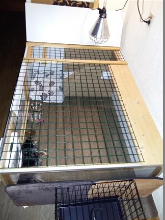 In de doos is het behagelijk warm door de warmtelamp die er boven hangt, de thermometer houden we gedurende de dag goed in de gaten, als de temperatuur in de kamer oploopt, moet de lamp hoger gehangen worden, anders wordt het te heet.