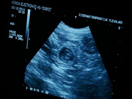 | 22 december 2014, eindelijk is het dan zo ver, 28 dagen na de dekking, dus tijd voor de echo om te kijken of Fleur drachtig is |