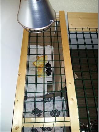 In de doos is het behagelijk warm door de warmtelamp die er boven hangt, de thermometer houden we gedurende de dag goed in de gaten, als de temperatuur in de kamer oploopt, moet de lamp hoger gehangen worden, anders wordt het te heet.