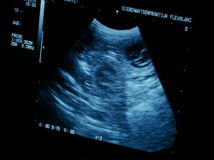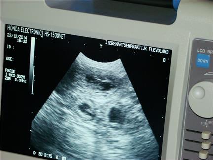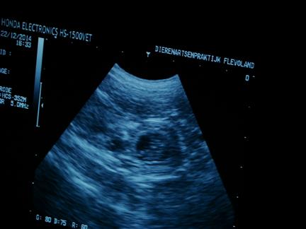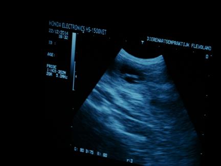 | 22 december 2014, eindelijk is het dan zo ver, 28 dagen na de dekking, dus tijd voor de echo om te kijken of Fleur drachtig is |